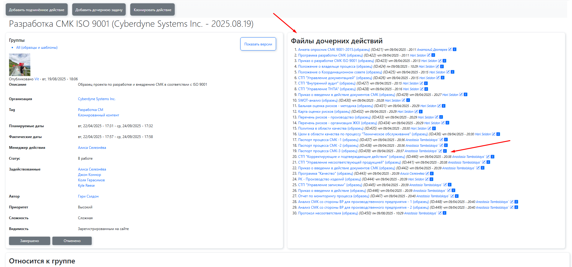 Хранение и управление файлами: Все файлы хранятся с версионностью — вы можете просматривать историю изменений, редактировать и клонировать документы внутри группы. Возможность использования файла в нескольких материалах группы различных типов (действиях, статьях, контактах, тегах и т.д.). списка файлов дочерних действий на странице родительского действия с возможностью использования в всплывающих окнах таблиц изменений каждого из файлов