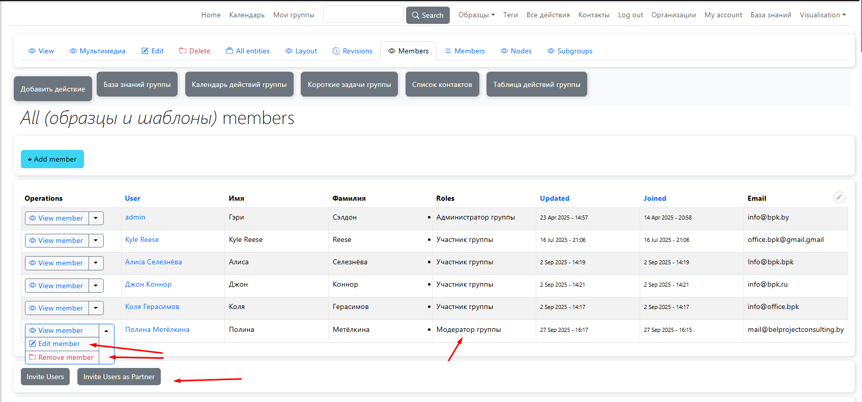 Управление ролями и доступом: Внутри группы назначаются роли — администратор (полный контроль), модератор (модерирование контента), участник (операционная работа) и партнёр (ограниченный доступ). Это обеспечивает гибкое регулирование доступа, включая возможность приглашать внешних пользователей с партнерскими правами только к выбранным материалам