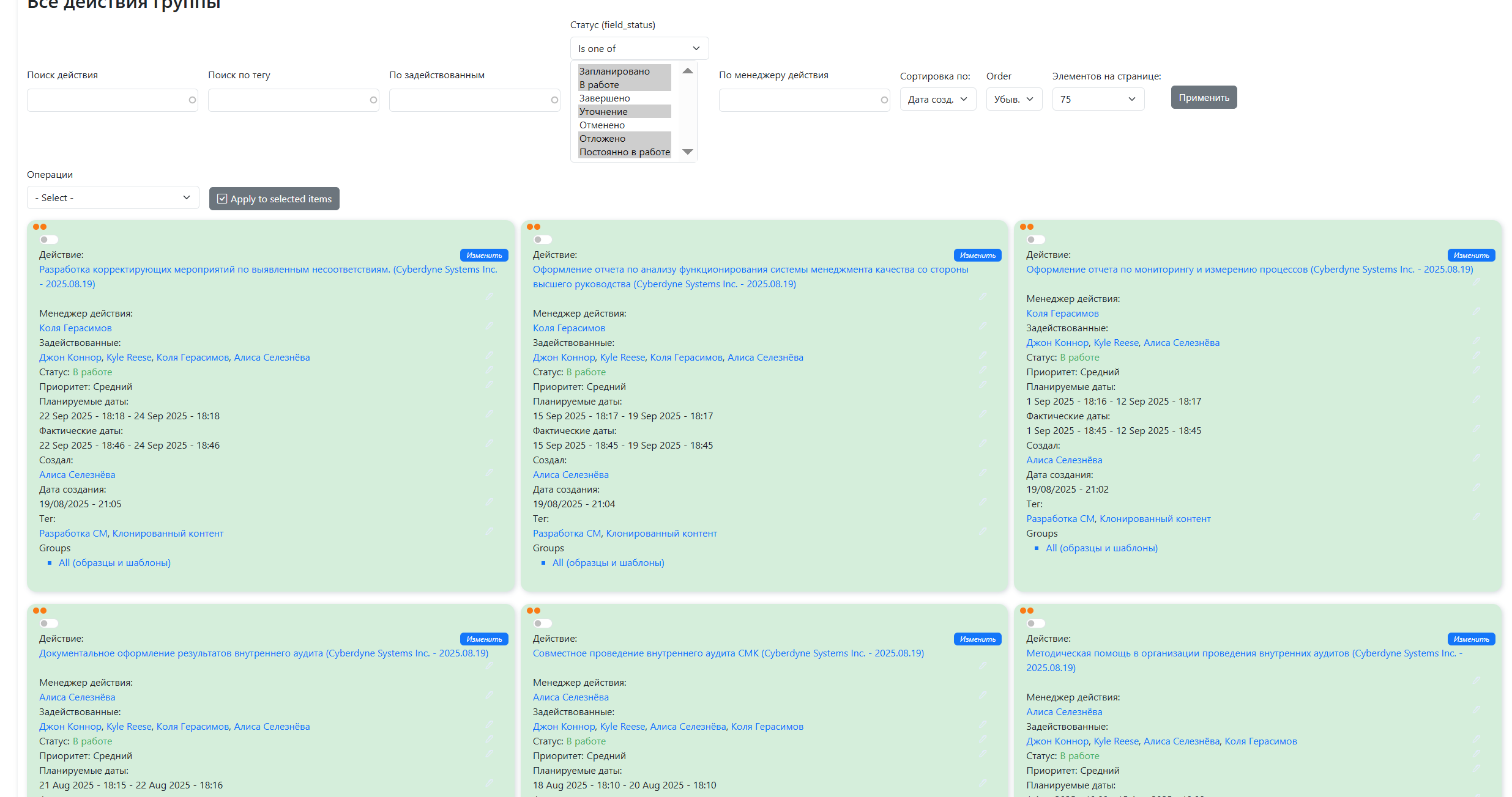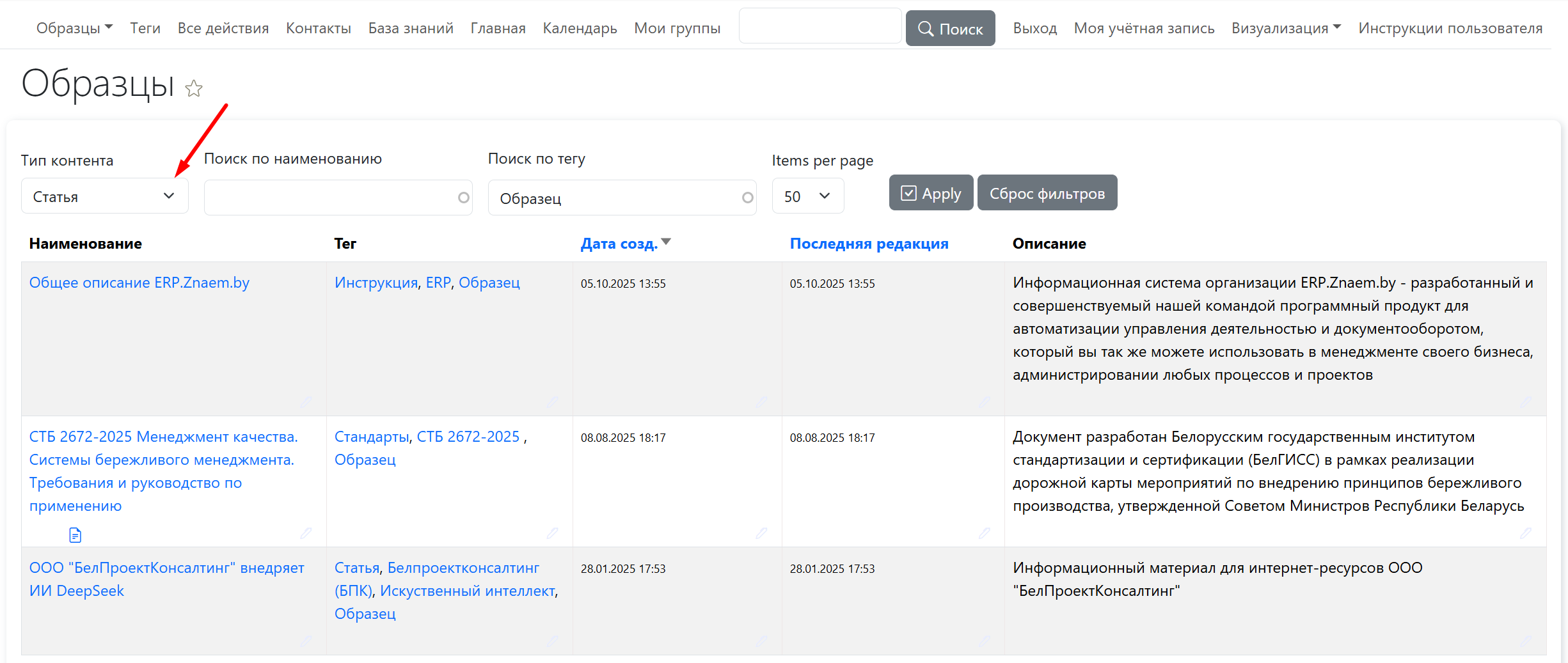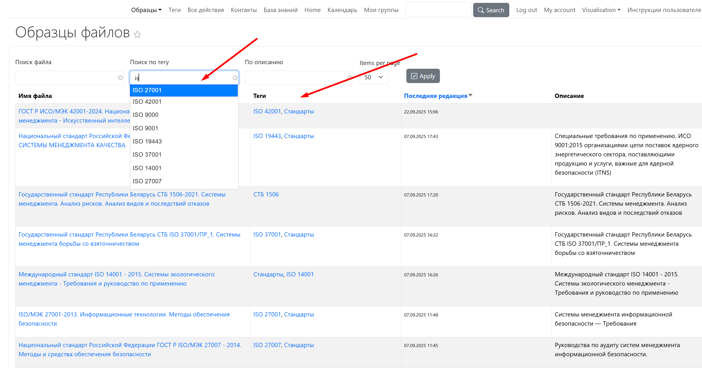 • Фильтровать контент: пользователи могут быстро находить материалы (действия, статьи, файлы) по категориям или ключевым словам (тегам) через удобные интерфейсы, такие как выпадающие списки, чекбоксы или поисковые фильтры
