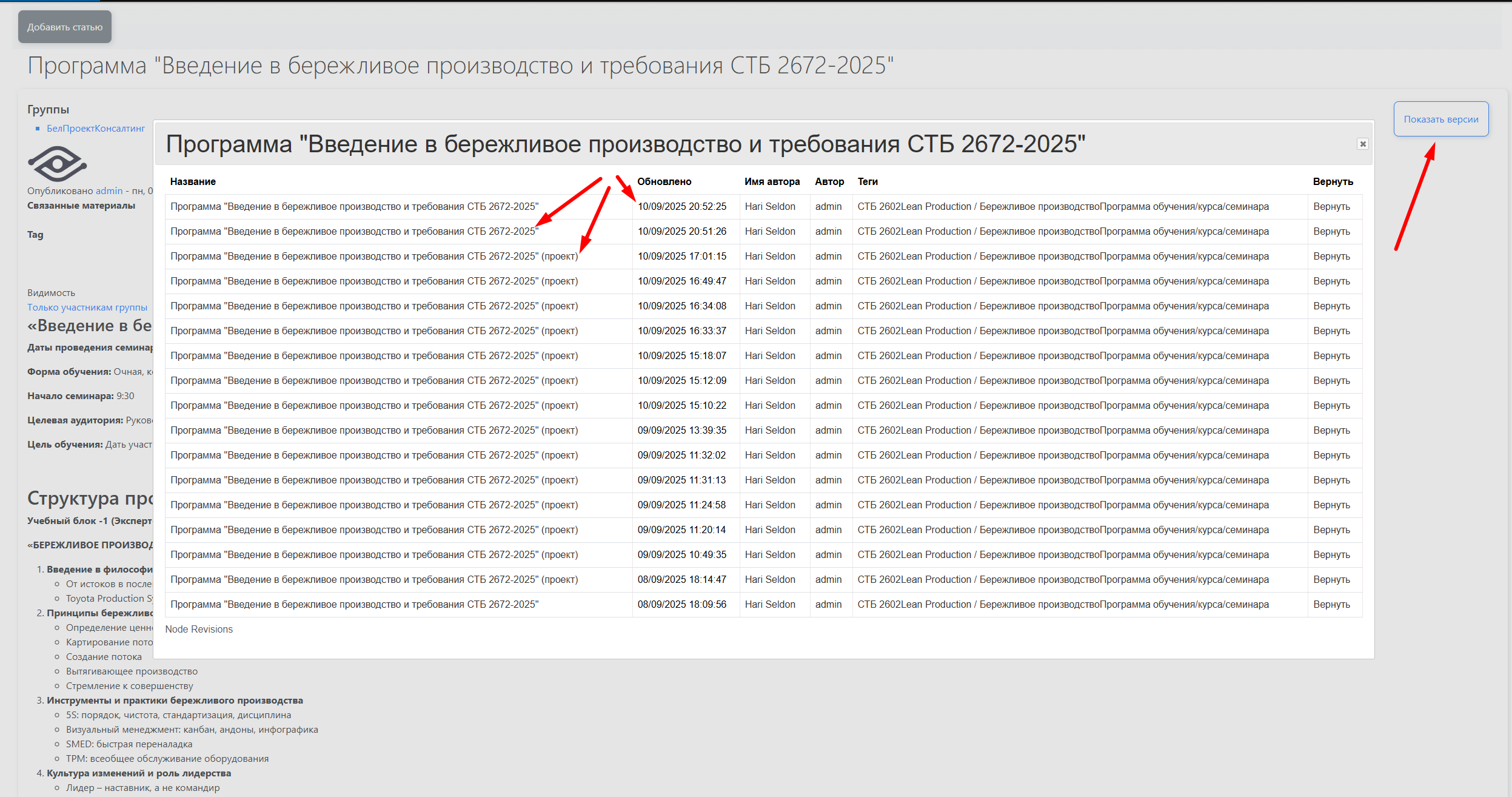 Дополнительно: Хронология изменений для любых материалов (действия, статьи, теги, файлы) — таблица с историей правок для аудита и восстановления